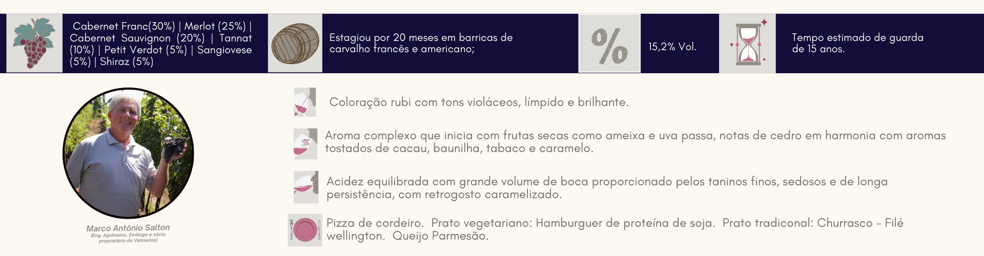Cab. Franc (30%) Merlot (25%) Cabernet Sauvignon (20%) Tannat (10%) Shiraz (5%) Sangiovese (5%) Petit Verdot (5%)